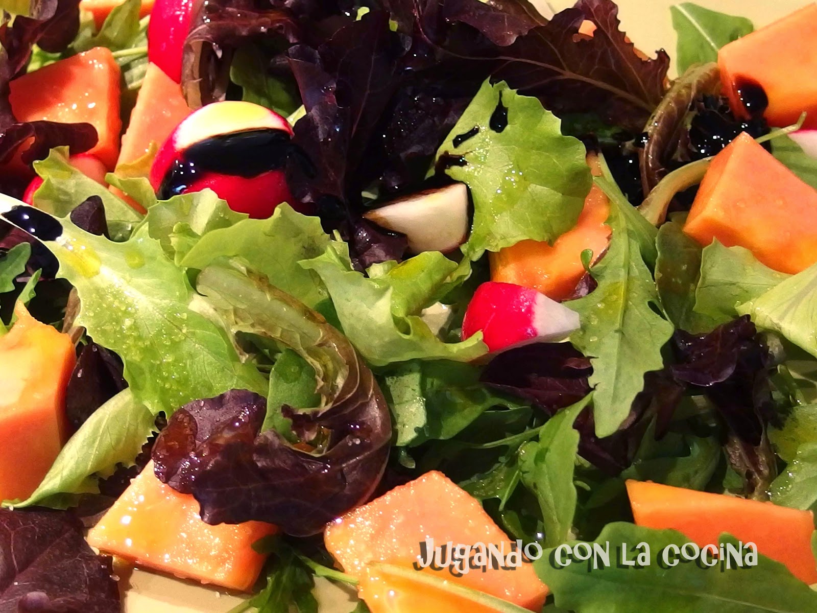 Colocar la mezcla de lechugas y rúcula sobre una bandeja. Limpiar de semillas y piel la papaya, cortar en dados grandes y añadirlos. Cortar el jengibre fresco en cubos pequeños y los rabanitos lavados en discos, repartiendo sobre la bandeja y mezclar todo. Salpimentar todo, aliñar con el aceite de oliva virgen extra y el vinagre reducido, colocando las anchoas por encima.