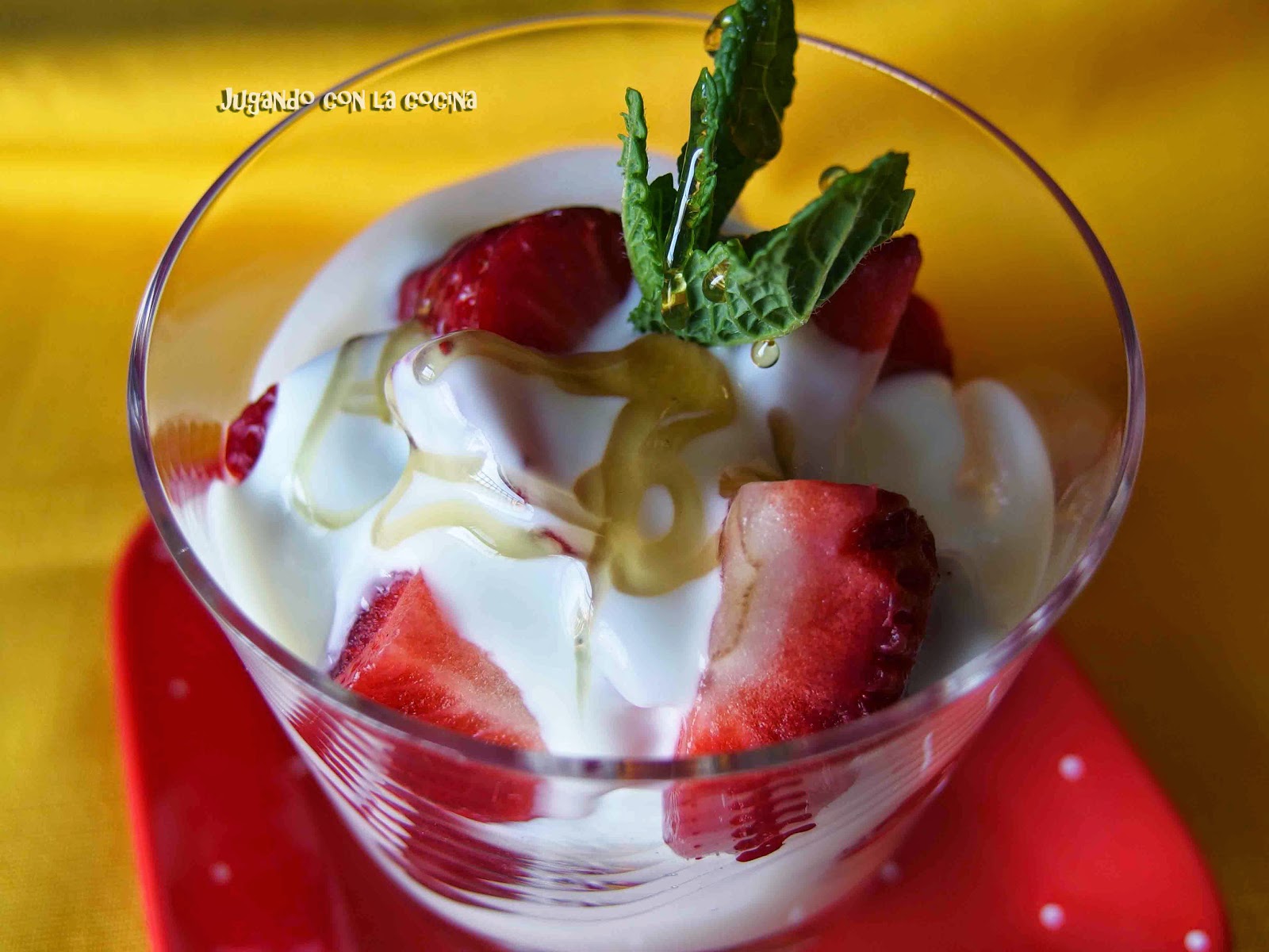 En el recipiente donde los vayáis a servir, colocar los fresones, añadir yoghourt hasta cubrir parcialmente la fruta y poner aparte la miel para que cada persona se sirva a su gusto. Adornar con hojas de hierbabuena.