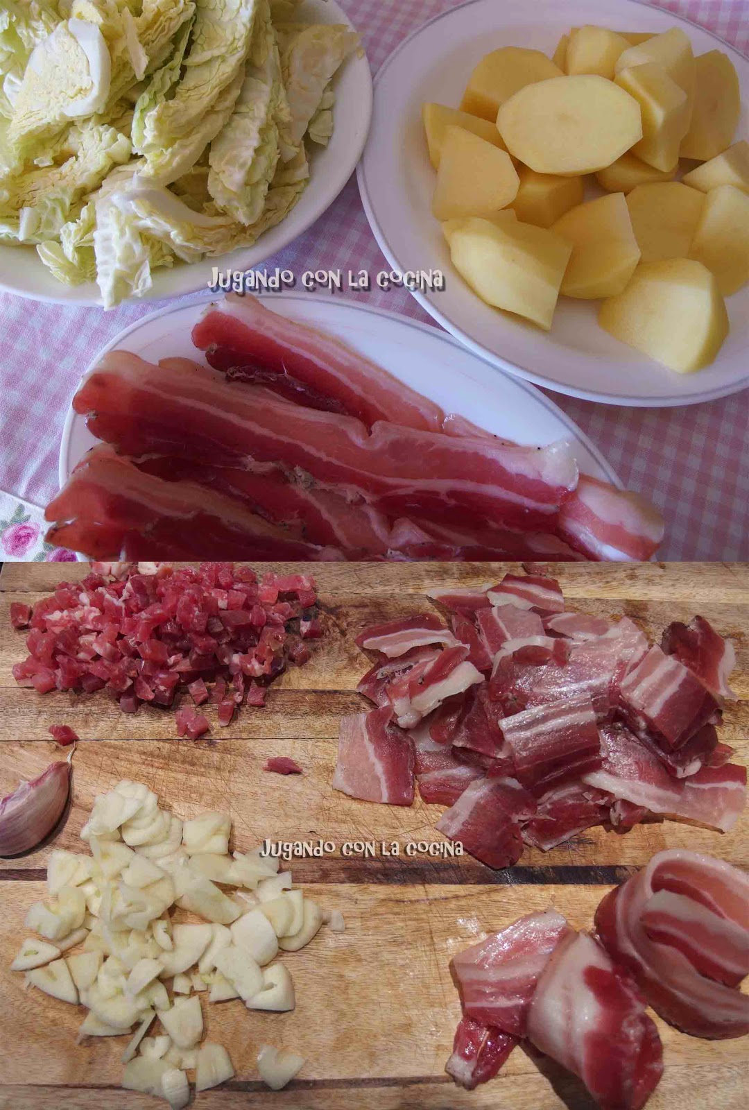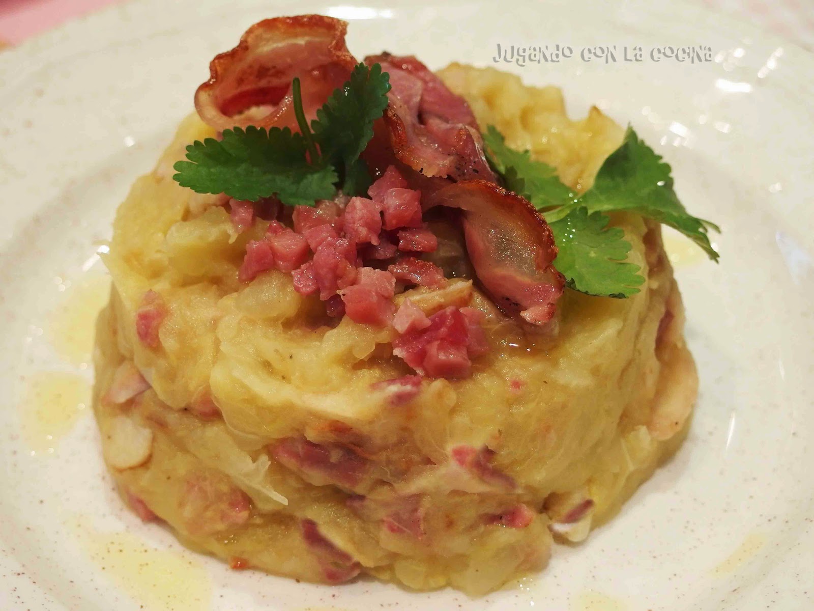 3 - Cuando estén hervidas la patata y la col, escurrir y volcar en la sartén en la que tenemos la panceta etc., dejar dorar y triturar con un tenedor de madera hasta que quede deshecho y bien mezclado con la panceta y el jamón.