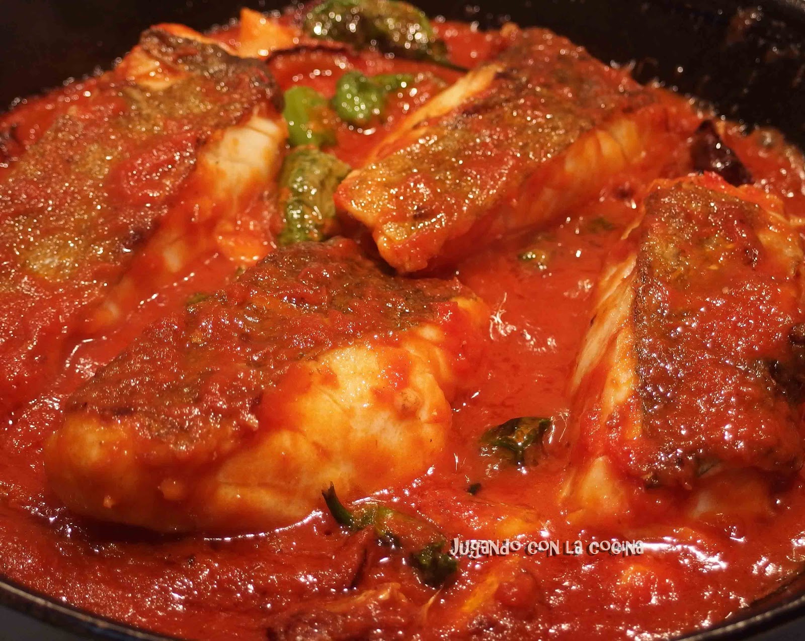 Cuando el tomate esté listo incorporar el bacalao y dejar dos minutos para que recoja todo el sabor de la salsa. Tapar la sartén y dejar reposar hasta que quede tibio.
