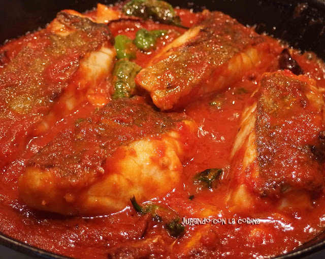 Los ingredientes que lleva, además del bacalo que puede ser fresco o desalado, son los pimientos de Padrón, dice el refrán en gallego "coma os pementos de Padrón, uns pican e outros non"...aunque en mi caso picaban todos ;-) y le dieron un delicioso sabor a todo el conjunto.