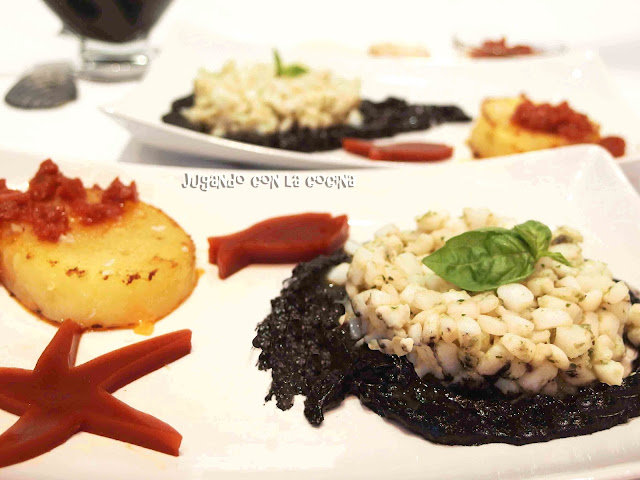 Extendemos una cucharada de pesto negro sobre la cual colocaremos un aro que rellenaremos con el calamar cocinado. Al lado pondremos la patata con un poco de aceite de gelatina de pimentón por encima.