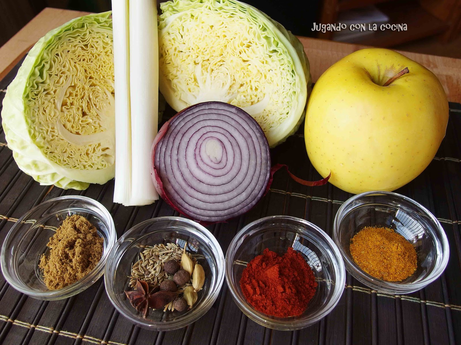 Añadir primero la cebolla roja, esperar que tome color y agregar el puerro, dejar pochar todo el conjunto unos 5 minutos, poner la col dejando un hueco de la sartén libre para añadir una cucharada de aceite de oliva y añadir las especias en polvo, el comino, el curry y el pimentón. Remover las especias, agregar la sal y el agua, mezclar todo el conjunto, tapar la sartén y dejar cocer 10 minutos. Pasado ese tiempo la col ya estará bastante cocida, entonces poner la manzana y dejar cocer 5 minutos más.