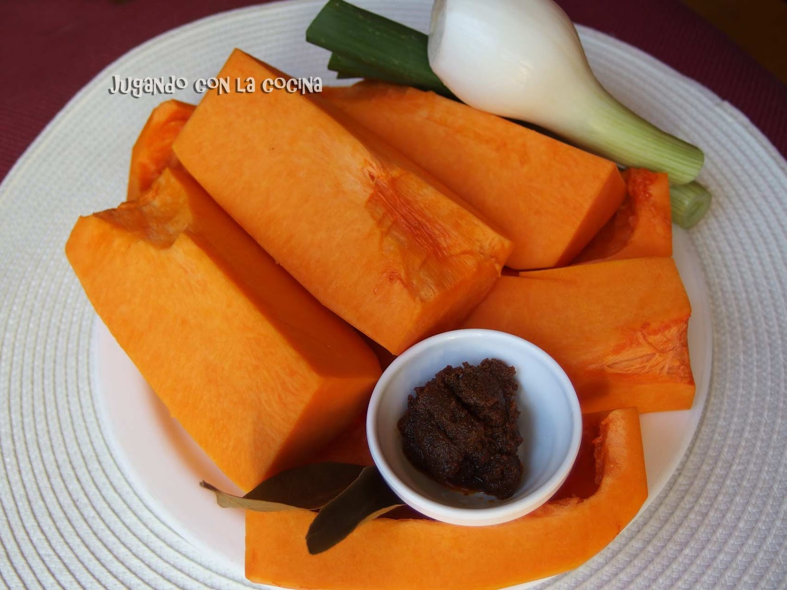 En una olla calentamos dos cucharadas de aceite de oliva virgen, incorporamos primero la cebolleta, la dejamos sofreír hasta que se dore un poco y añadimos la hoja de laurel, la pasta de curry rojo y la pizca de comino, removemos y agregamos la calabaza. Dejamos 2 minutos a fuego vivo.
