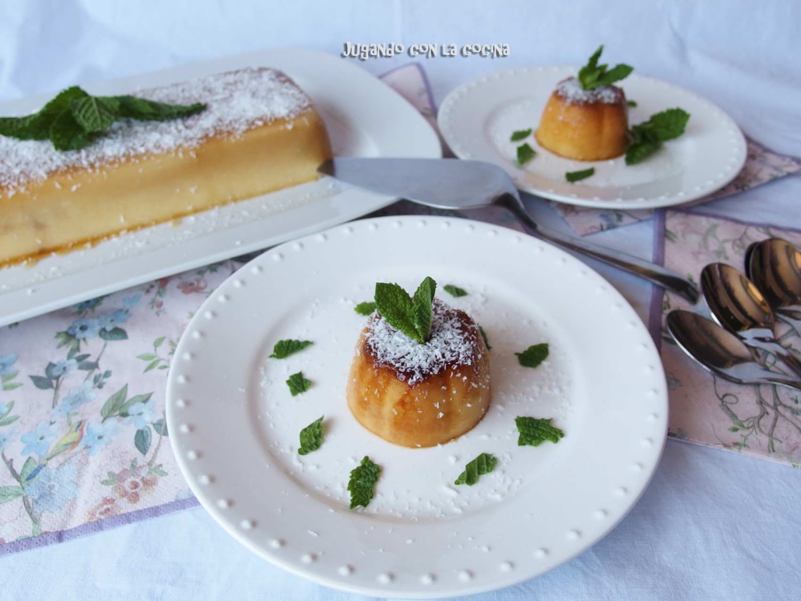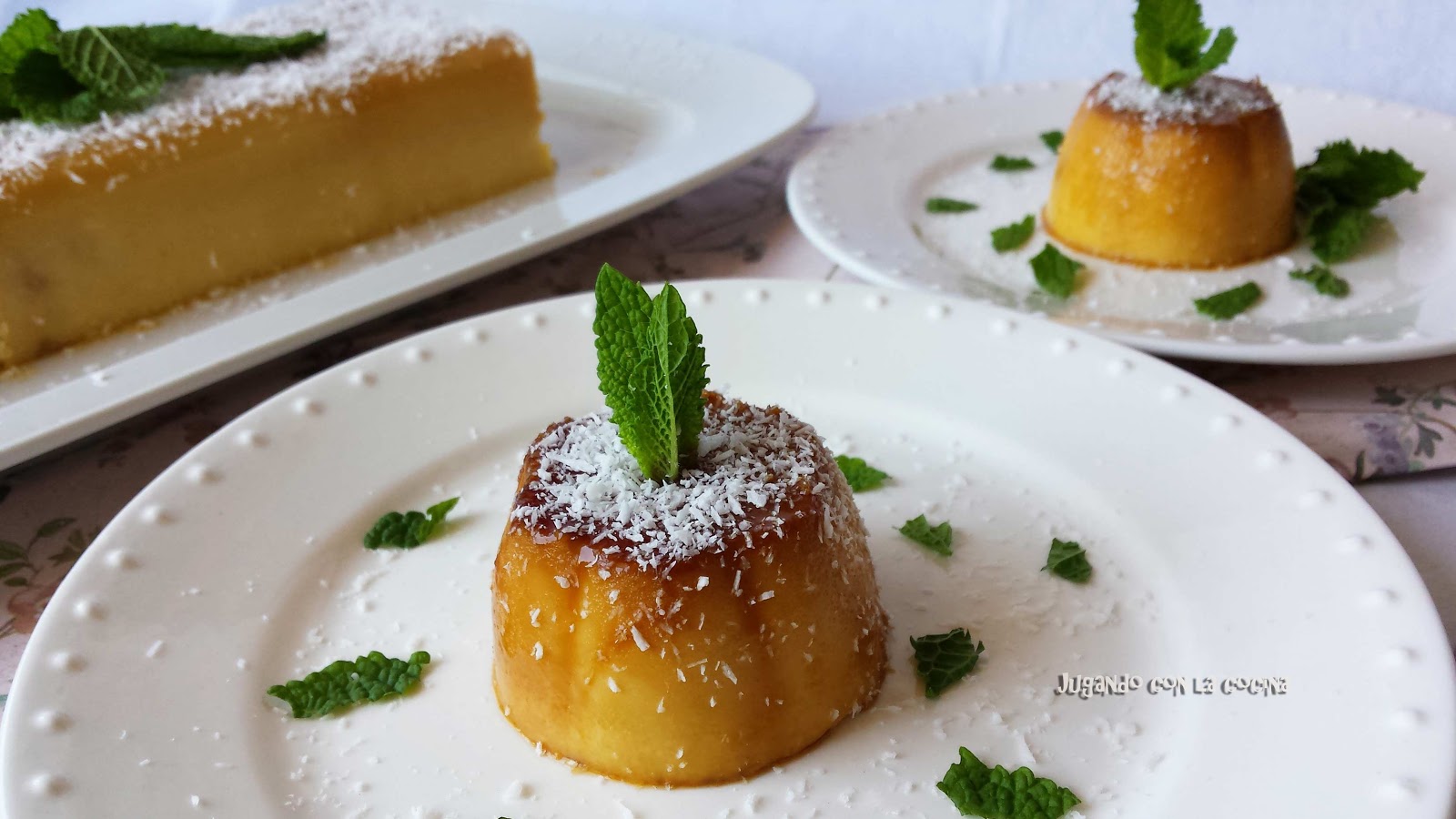 El coco flota y al solidificarse el flan queda en la parte superior del molde, de forma que al desmoldarlo el coco quedará en la base.