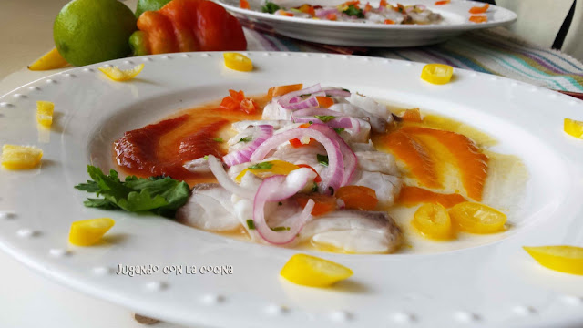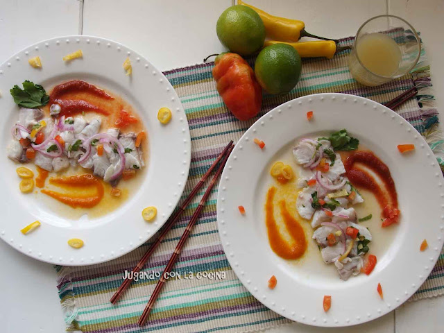 Esta es mi versión de la receta, muy parecida en lo básico a la original que saqué de una página en la red, pero con algún proceso distinto para simplificarla, como no colar el jugo o "leche de tigre" antes de poner el pescado, ni hacer la mezcla de la pasta de pimientos con el jugo por separado para añadirla después al plato.