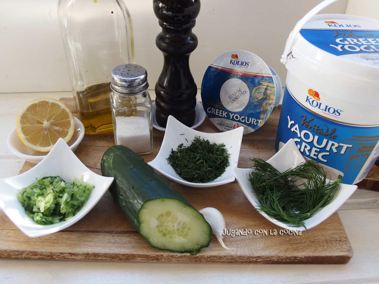 Gran parte del atractivo de esta elaboración radica en el yogur griego, que debe ser de muy buena calidad y cuanto más espeso mejor, si tenéis ocasión probad a prepararla con un yogur griego auténtico, de importación y veréis que tanto la textura como el sabor son impresionantes. Para esta elaboración he usado uno de la marca Kolios que me suministró Olimpo Gourmet, S.L., es menos agrio y muy consistente lo que la da una textura deliciosa a la salsa.