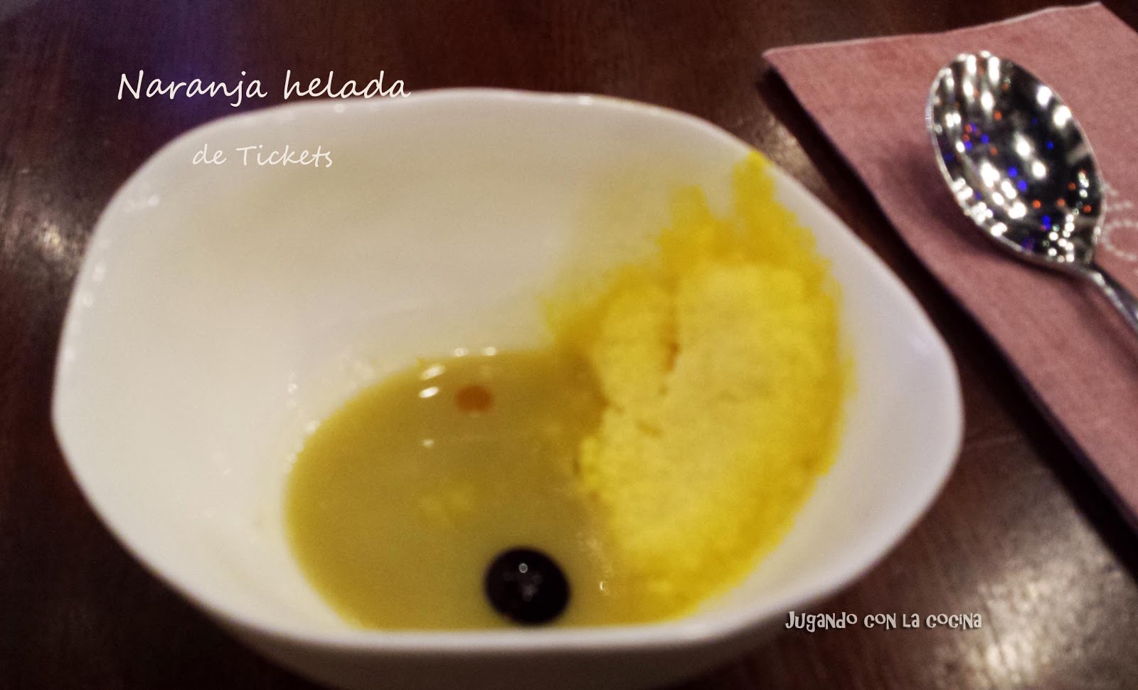 Naranja helada con jugo de aceituna gordal, aceite de pipas de calabaza y bicho.