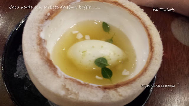El postre que tomó mi marido, aunque yo también lo probé ;-) fue una pasada, el coco natural era el recipiente que contenía las primeras capas cremosas de la formación del coco, su agua natural condimentada y el sorbete de lima kaffir. Sin palabras, exotismo en estado puro.
