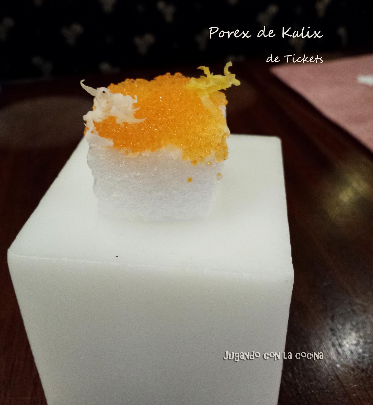 Es un cubo con textura de nube porosa y total aspecto de Porex realizado con dashi y que se funde en la boca, coronado por la crema ahumada, una capa de huevas de Kalix y un toque de raifort que es un tipo de rábano. Bocado exquisito.