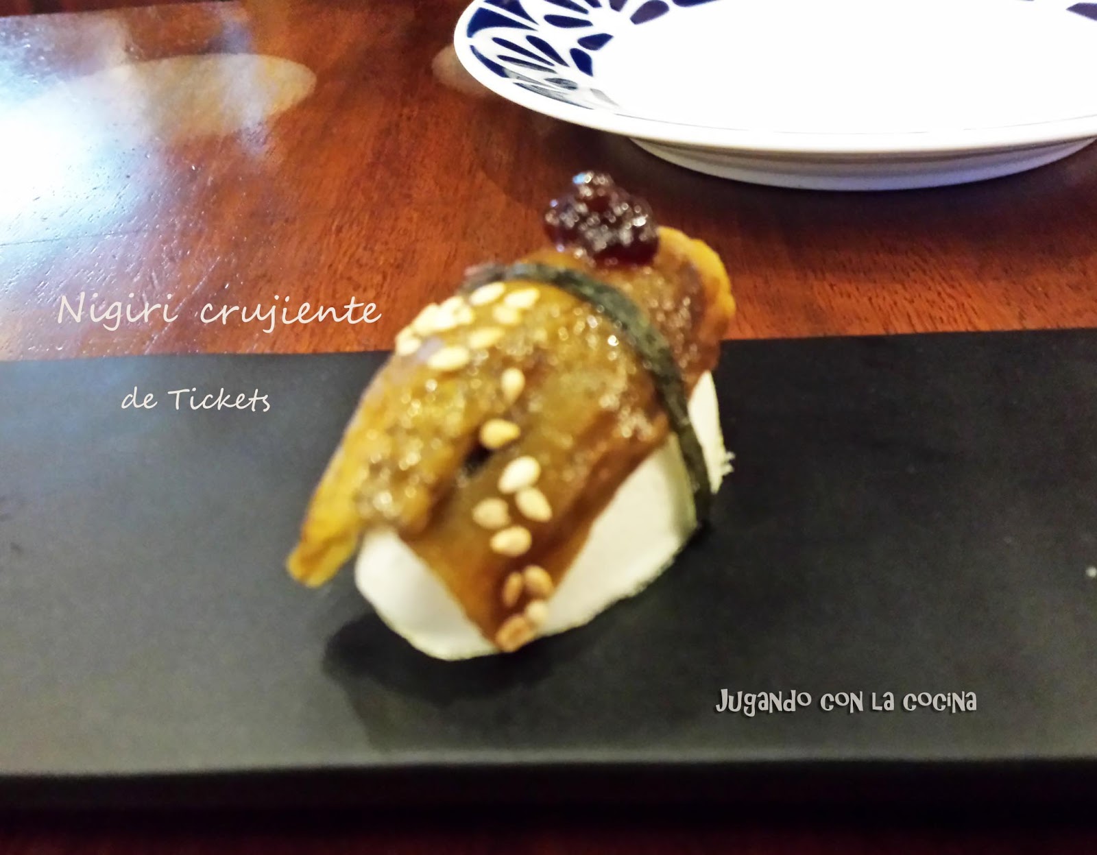 La base del nigiri (voy a improvisar porque no tengo ni idea de lo que está hecha realmente la masa) es superligera, del tipo souflé o similar, muy etérea en boca y va cubierta por una lámina de berenjena braseada en el horno Josper que le da un sabor ahumado espectacular y lleva por encima unas perlas de soja, algo de sésamo .... y que aconsejan comer enseguida para que no pierda su textura. Una delicia.