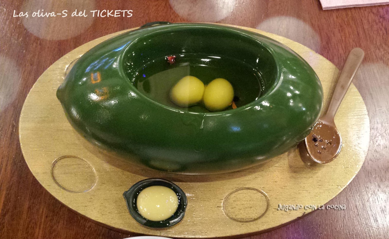 Esferificaciones en forma de aceituna flotando en un aceite especiado, que estallan en la boca liberando su jugo, una sensación que me encanta, ya las había probado en Bodega 1900 pero el sabor de estas es distinto y no sabría cual elegir, me quedo con las dos.