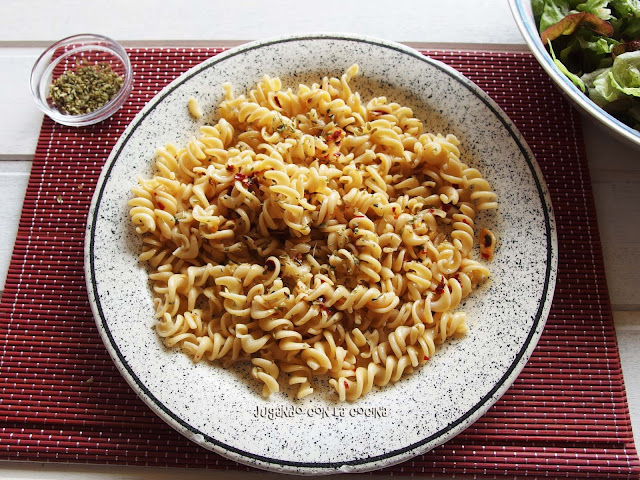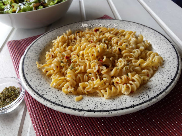 Suelo cocinar pasta a menudo, con diversas salsas, a mi puede decirse que me gustan todas las pastas y sus salsas ;-))) . Hoy he elegido una bien sencilla, el clásico ajo y aceite, condimentado con peperoncino una guindilla que me traje de Italia pero se le puede poner cayena, ají o cualquier otro que os guste. Este aliño no le puede ir mejor a la pasta de legumbre.