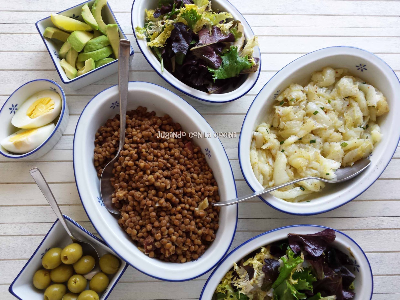 Se puede combinar según la imaginación de cada cual, a mi me gusta que lo ingredientes tibios como la lenteja y el huevo queden por encima de los demás, así que los pongo en el centro, al lado el bacalao y la ensalada alrededor.