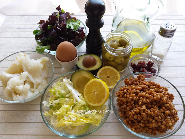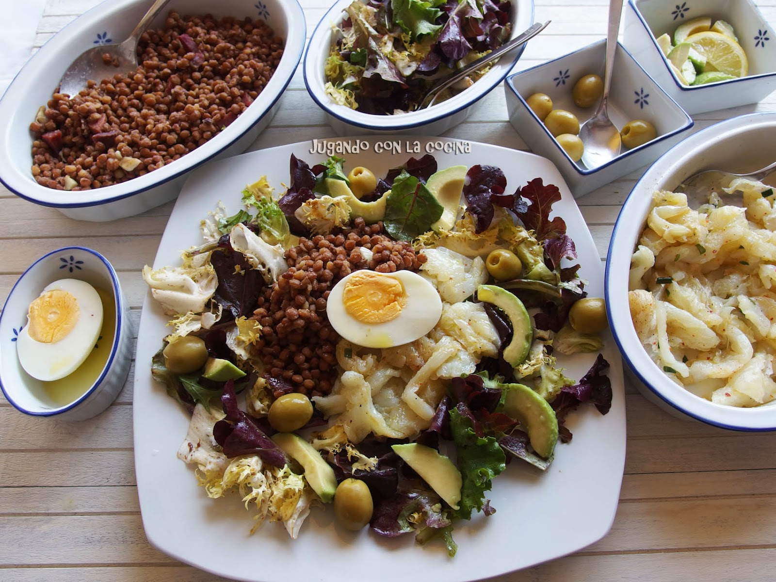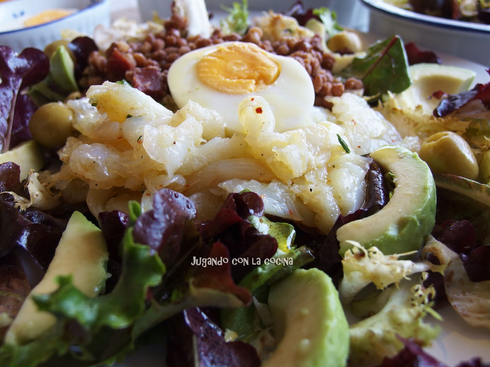 Más que una ensalada esta receta es un completísimo plato único, ya que reúne verdura (las lechugas), fruta (el aguacate y las aceitunas), legumbres (las lentejas) y proteínas (el bacalao, el jamón y el huevo), todos ellos productos de mercado fáciles de obtener y sin complicaciones.