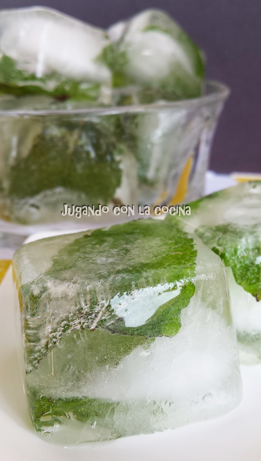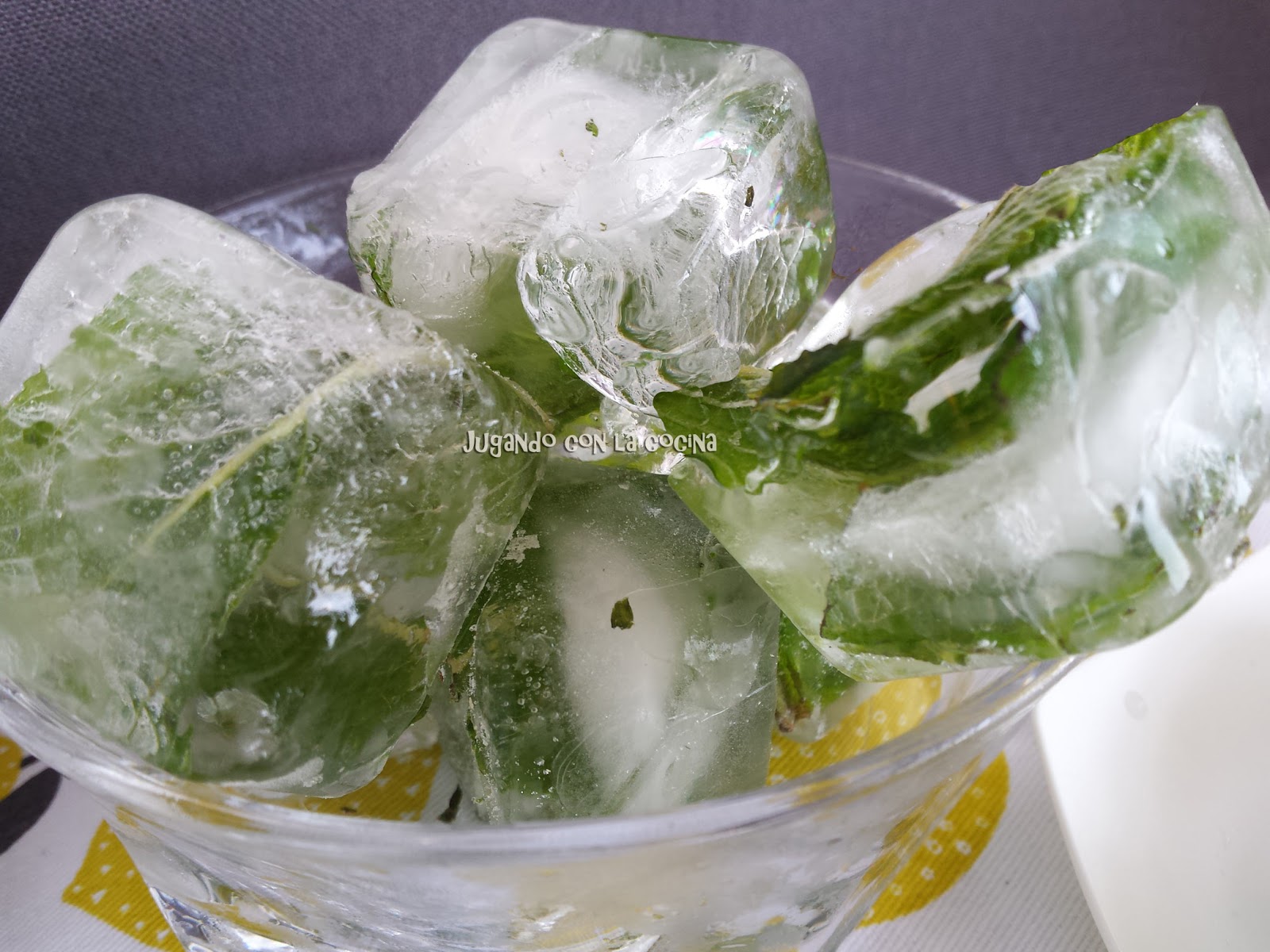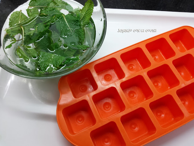 Lavar las hojas de menta o hierbabuena, colocar dos en cada hueco de la cubitera y cubrir con agua. Hay que ser cuidadosos y no dejar que sobresalgan las hojas del agua porque se queman con el frío.