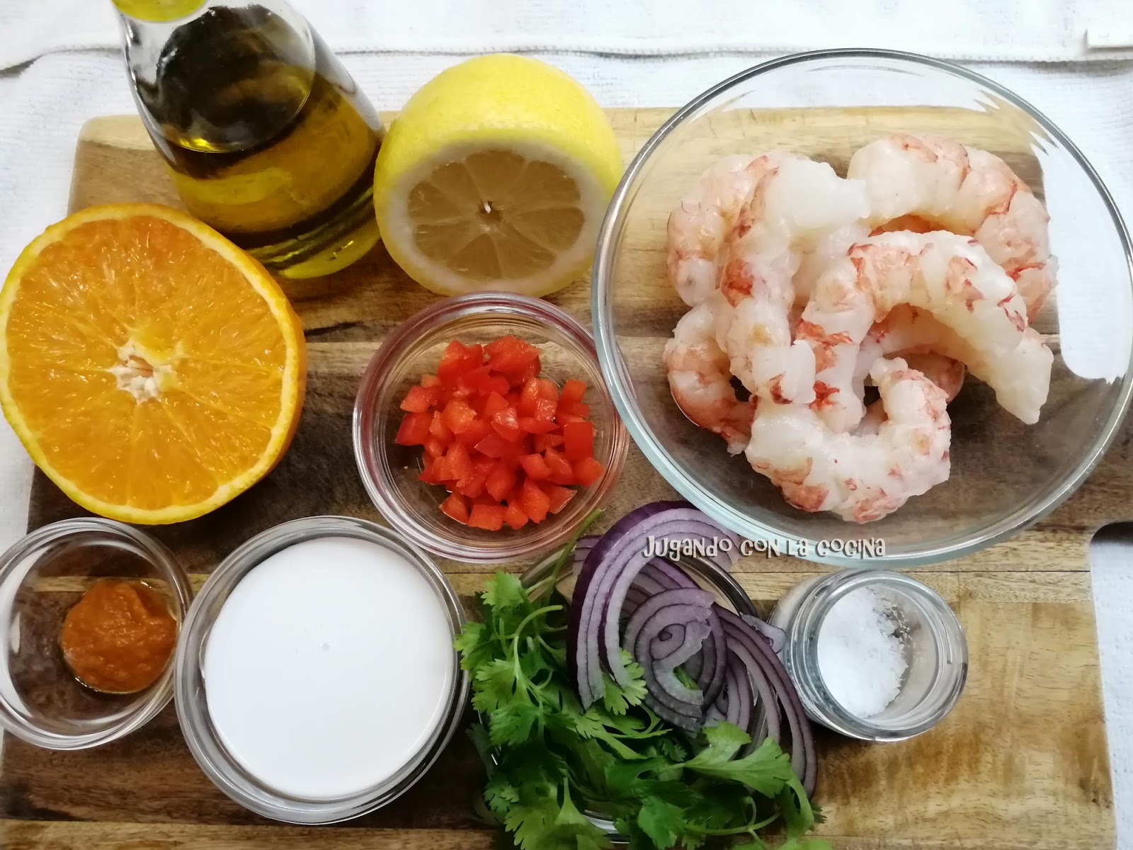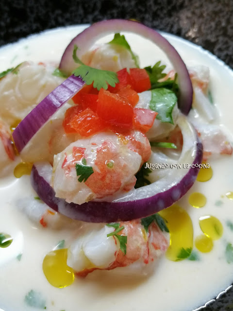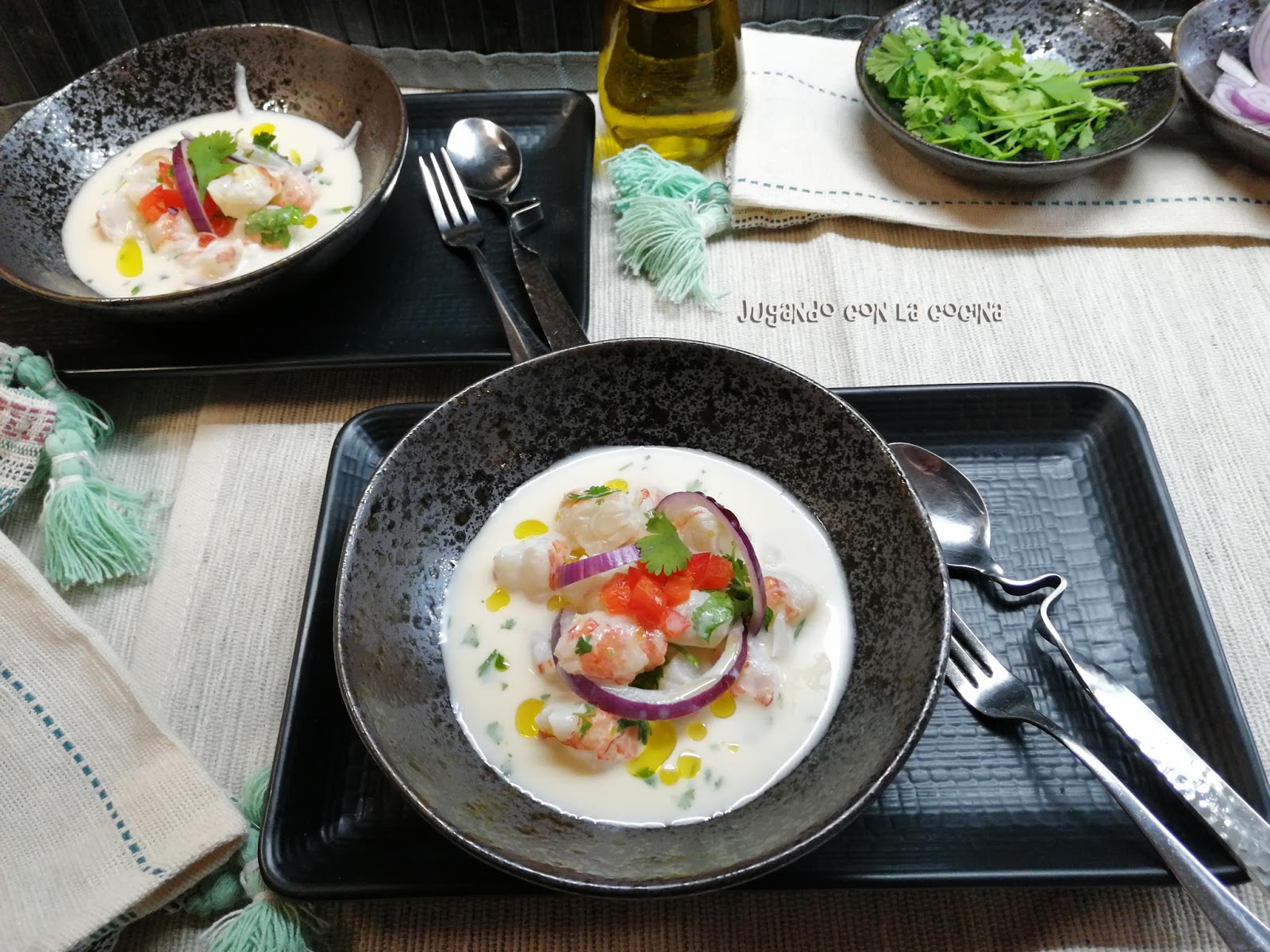 Este ceviche de gambas que os propongo hoy es una receta casera, inspirada en una tapa que tomé hace poco en una terraza de Barcelona. Lleva mi toque personal de naranja porque en los marinados creo que suaviza la acidez y además leche de coco que añadida a la de tigre hacen que la salsa sea distinta y deliciosa.
