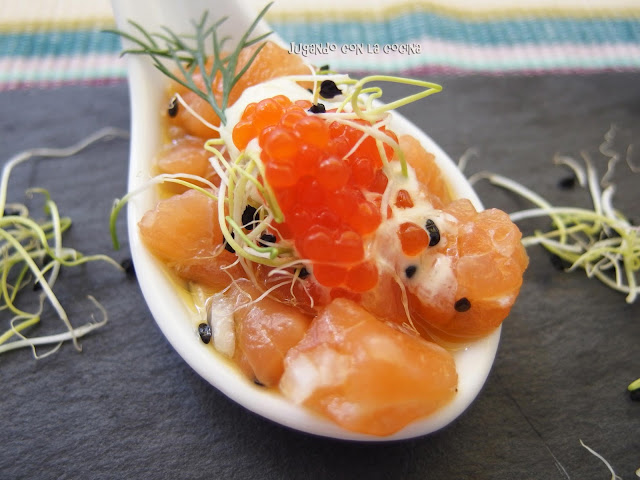 Poner una cucharadita de mayonesa de wasabi como base, una capa del salmón aderezado y agregar una cucharadita de mayonesa de wasabi más en la cumbre y otra de huevas. Coronar con germinados de puerro. Adornar con unas hojitas de eneldo.
