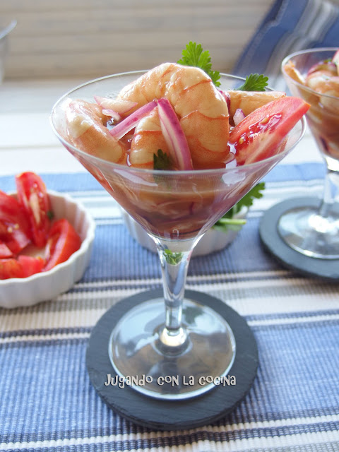 Va genial para abrir el apetito, fresco y ligero. Nos dejará preparados para el primer plato. Los langostinos con un ligero marinado de 30 minutos tienen bastante para quedar cocidos por fuera y jugosos por dentro, si los dejas más tiempo quedarán completamente cocinados y también están ricos.
