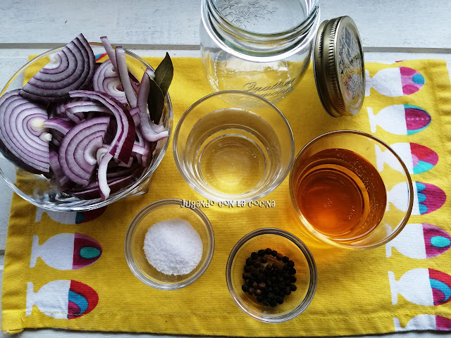 En un recipiente limpio, poner la cebolla cortada, añadir la sal, la pimienta y el laurel, añadiendo los líquidos a continuación procurando que cubran bien toda la cebolla.