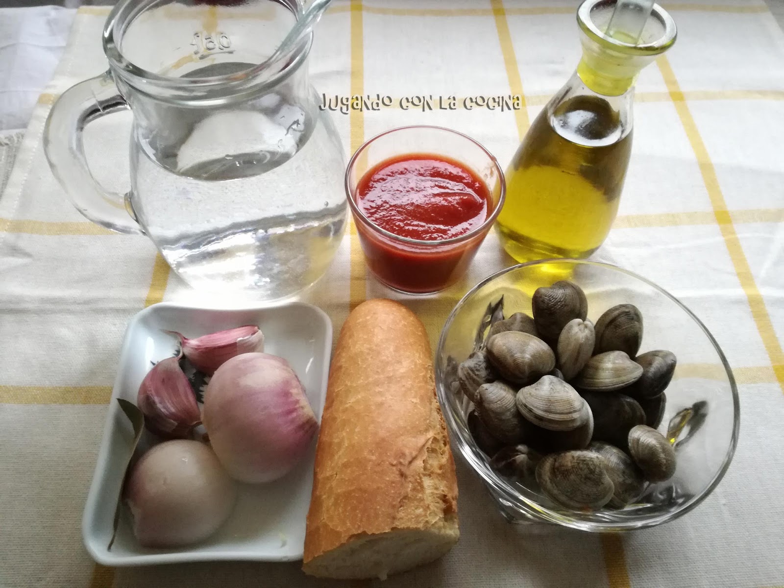 Como os decía sobre el estilo de mi yaya, esta receta lleva pocos ingredientes, básicamente agua, nada de caldos ni fumets elaborados durante horas; agua del grifo, almejas, bueno, chirlas o rosellona para ser exactos, pan y el consiguiente sofrito con bastante ajo.
