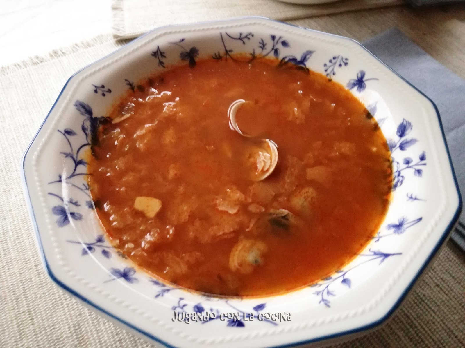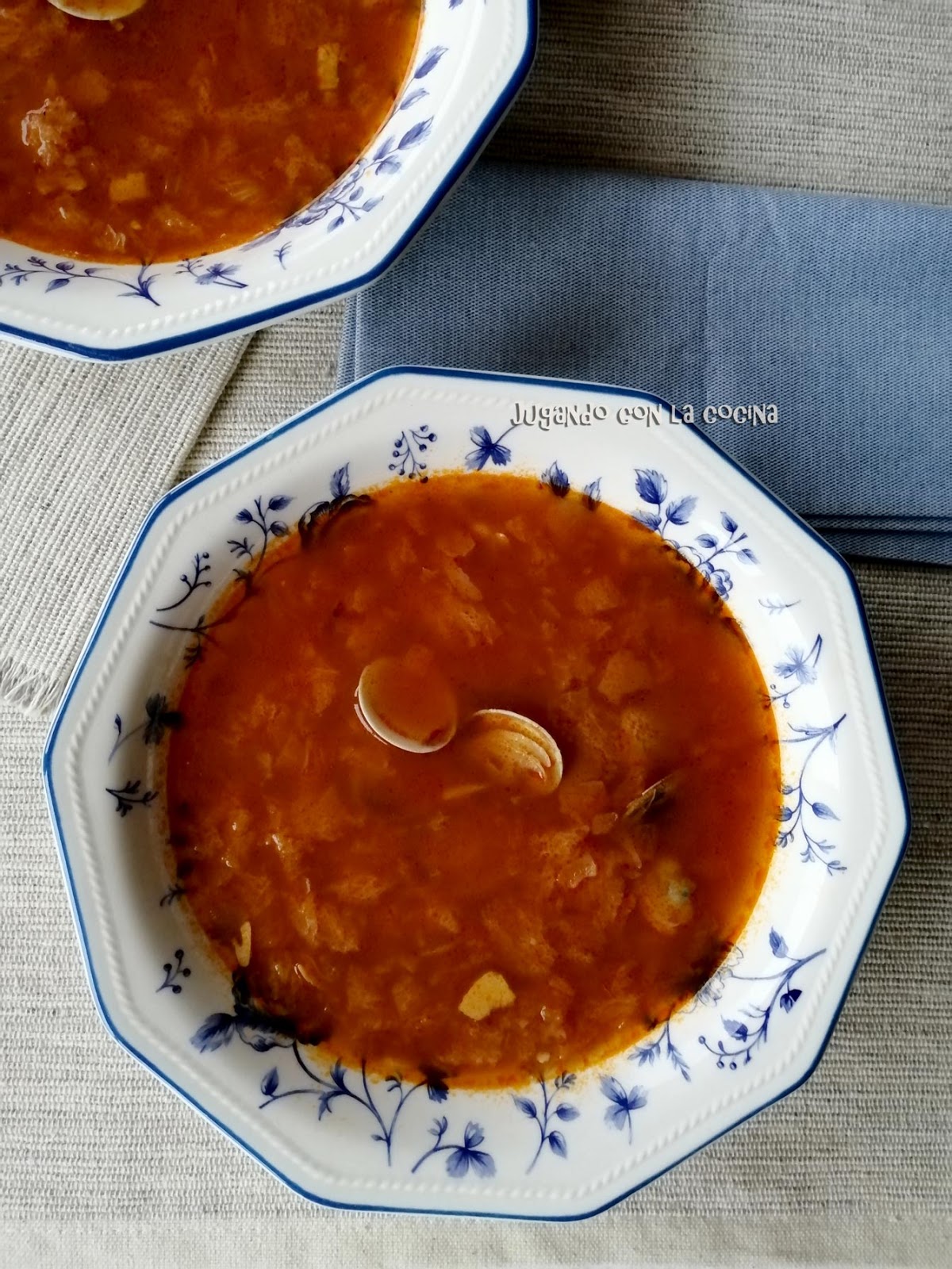 Cuando el sofrito esté listo, agregar el agua. Dejar que hierva 5 minutos. Remover para que el pan se deshaga y le dé consistencia al caldo. Cuando el pan esté blando añadir las almejas, tapar la cazuela y dejar que se abran, en cuanto estén abiertas retirar del fuego. Probar para ver el punto de sal porque las almejas aportan su parte y rectificar si es necesario.