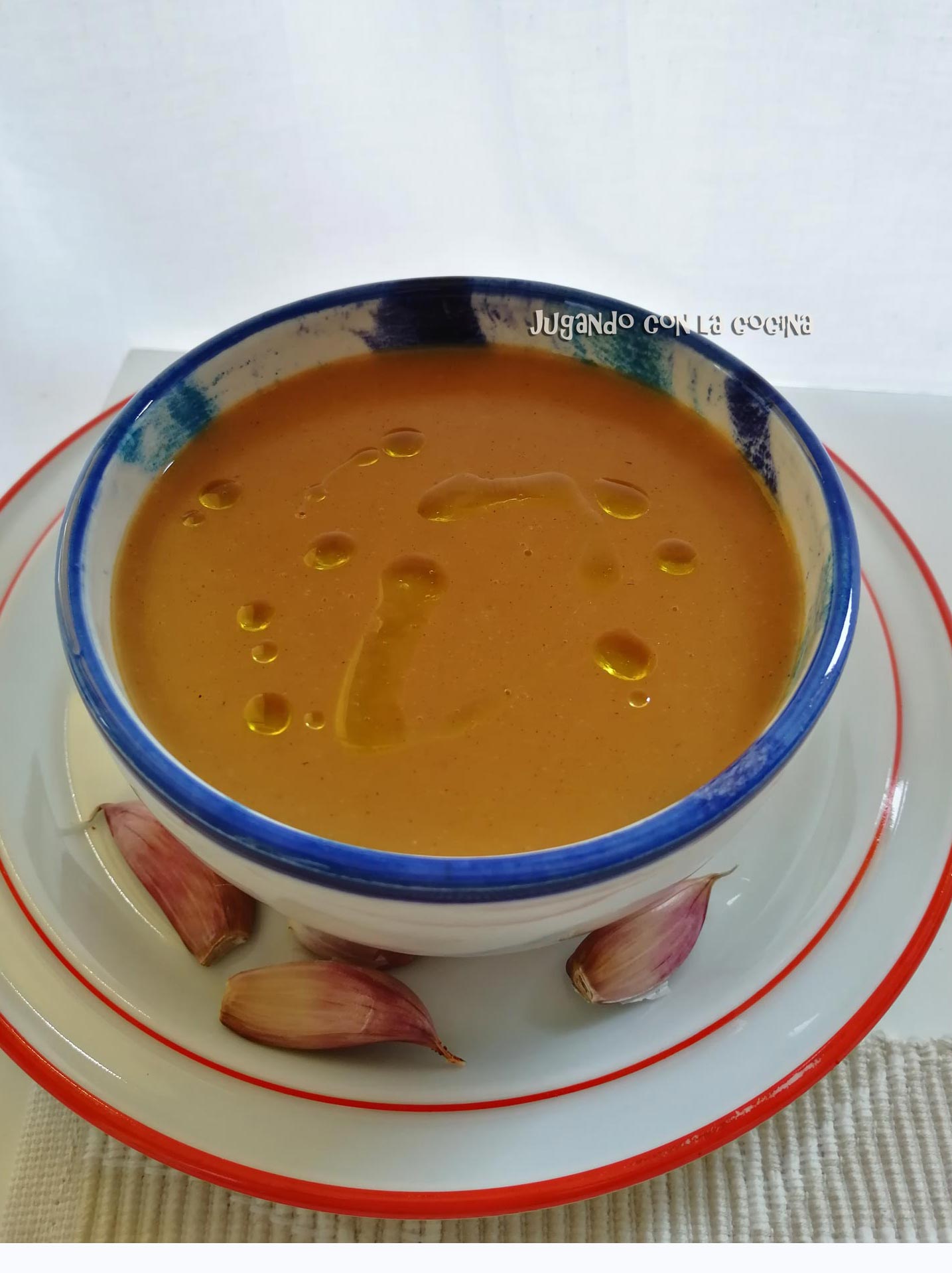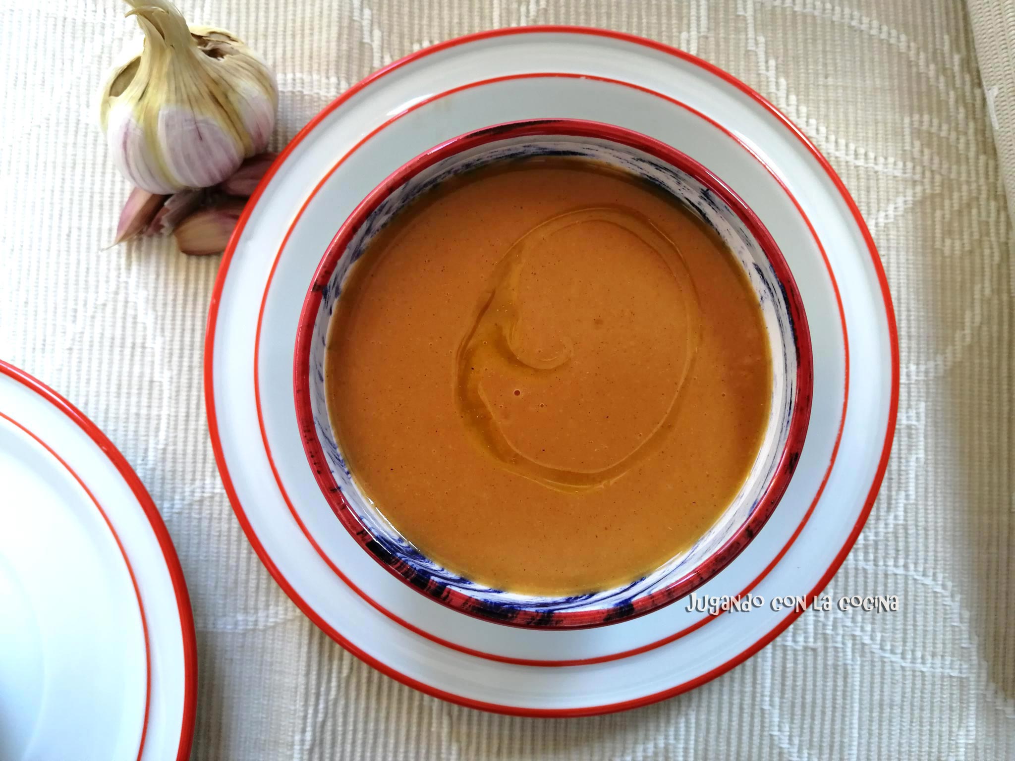 En realidad es un plato de aprovechamiento, la idea surgió de un sobrante de la mencionada sopa de ajo, que se espesó demasiado y decidimos aligerarlo con un poco de caldo y pasarlo por la trituradora.