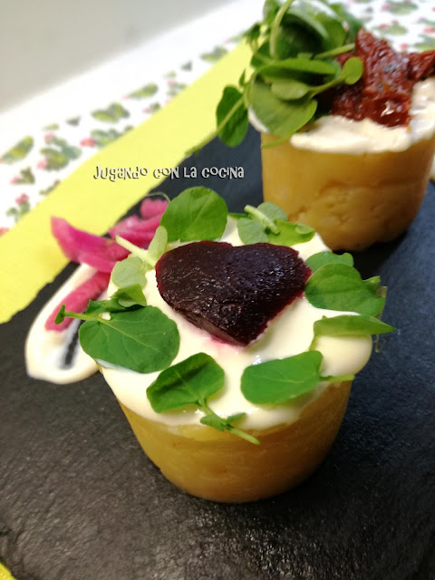 Para emplatar pondremos un aro y rellenaremos con el puré y encima colocaremos una cucharada de veganesa o mahonesa y la remolacha o el tomate en cada una acabando con las hojas verdes de ensalada (berros..etc.). Adornaremos también con unas gotas de salsa mezclada con ají alrededor del plato y cebolla roja encurtida.