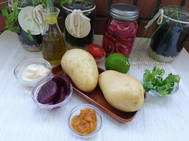 Las hemos coronado con una capa de esta salsa, berros, tomate confitado y remolacha. Esta base admite otras múltiples combinaciones para crear el topping. Como veréis en la imagen de los ingredientes también solemos usar cilantro, albahaca, perejil, etc.