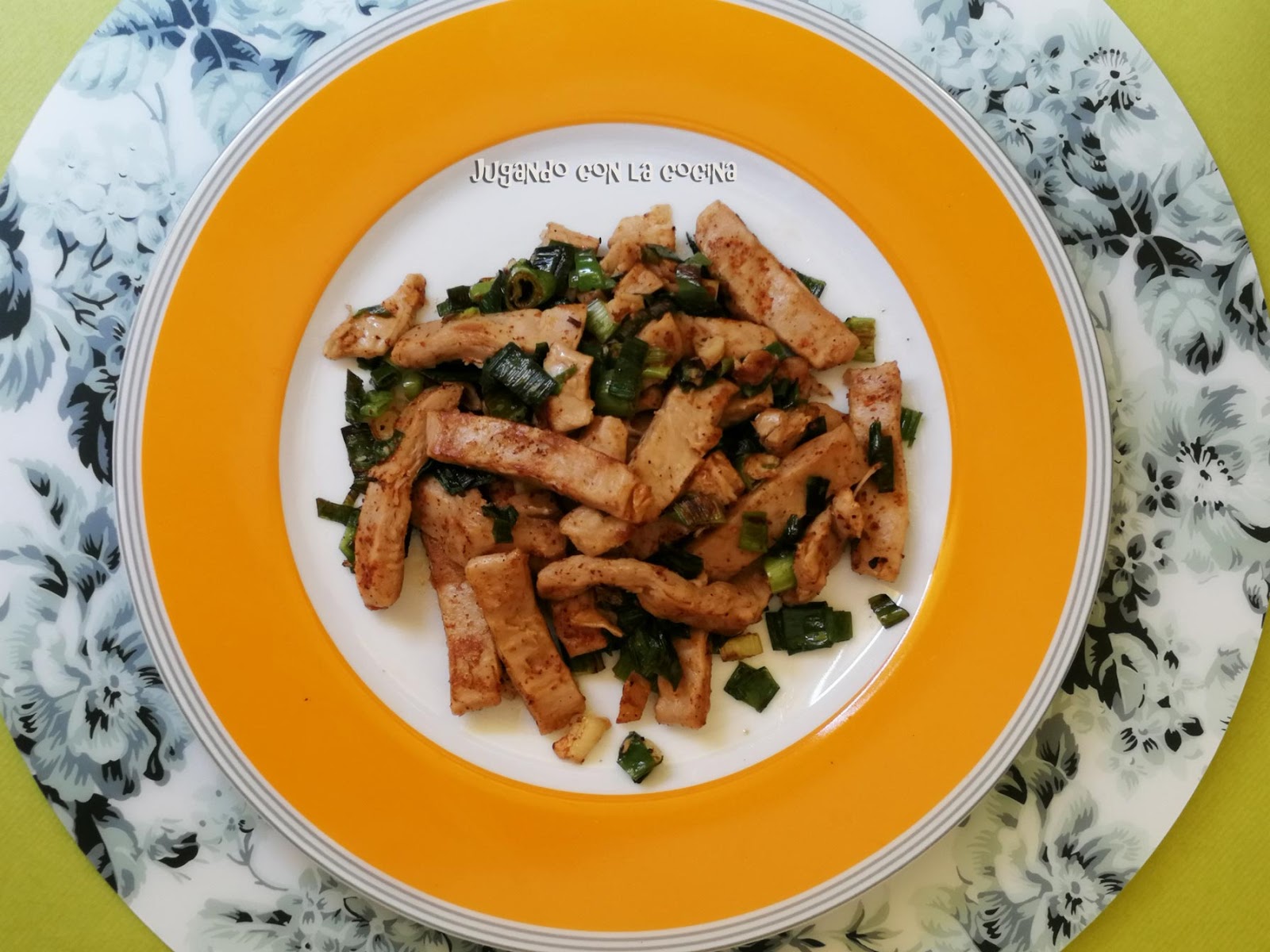 En una sartén con un poco de aceite, dorar las cebolletas y los ajos, cuando ya tengan un poco de color, añadir las tiras de Heüra y dejar cocinar hasta que se dore todo junto. Agregar sal y pimienta negra al gusto.