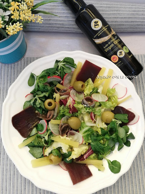 Poner una buena mojama de atún es básico, pero además, como en cualquier ensalada una parte importantísima del éxito final es el Aceite de Oliva Virgen Extra .