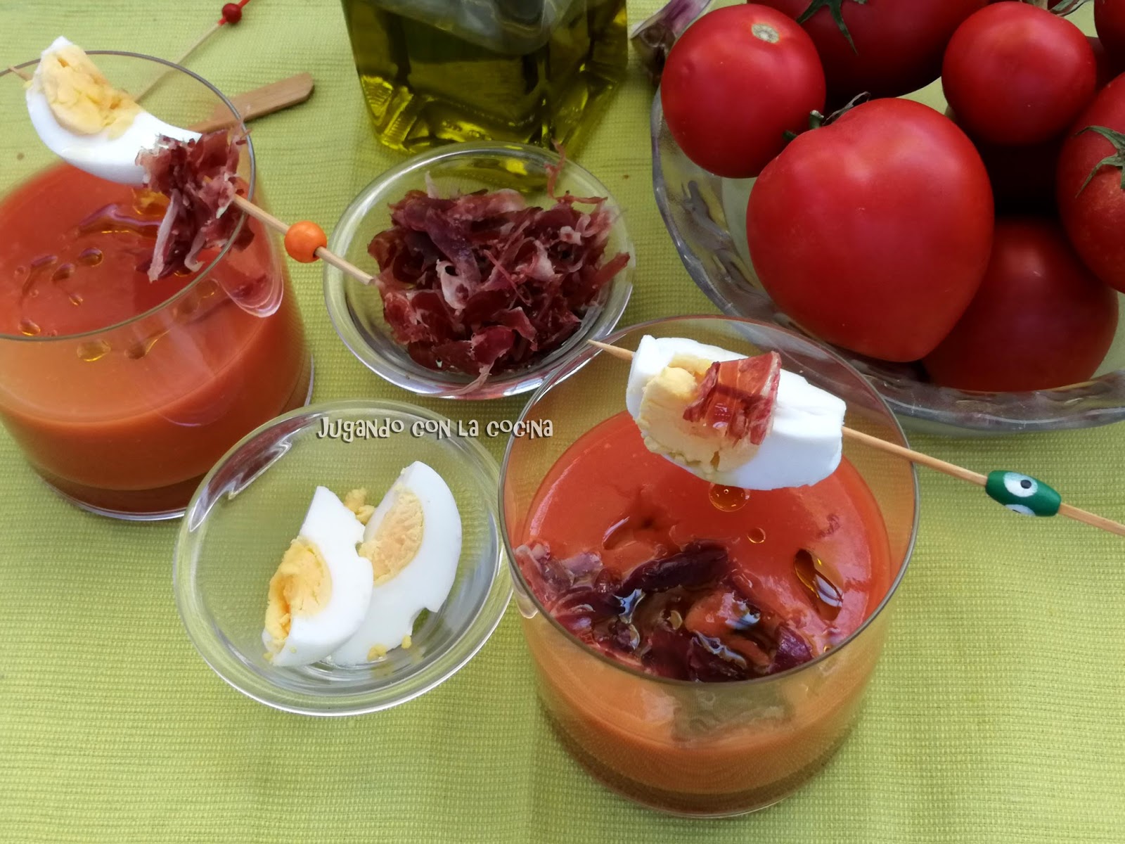 NOTA: Las cantidades de los ingredientes son orientativas. El Salmorejo tradicional es normalmente una crema espesa pero a nosotros nos gusta menos denso, así que si recomendamos comenzar con estas cantidades e ir aumentando el pan y triturar hasta alcanzar vuestro gusto.