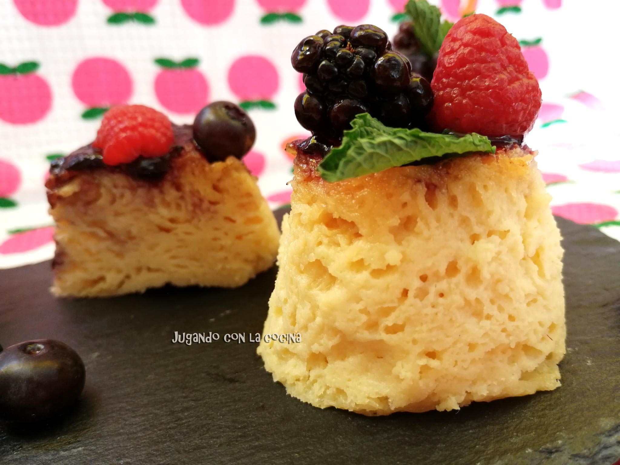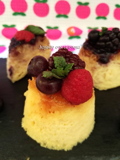 Desmoldamos y servimos los pastelitos bien fríos. Los podemos adornar con arándanos, frutos rojos, hojas de menta, etc.