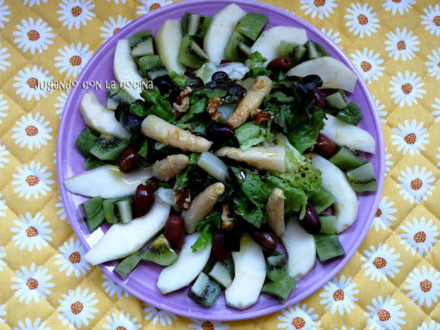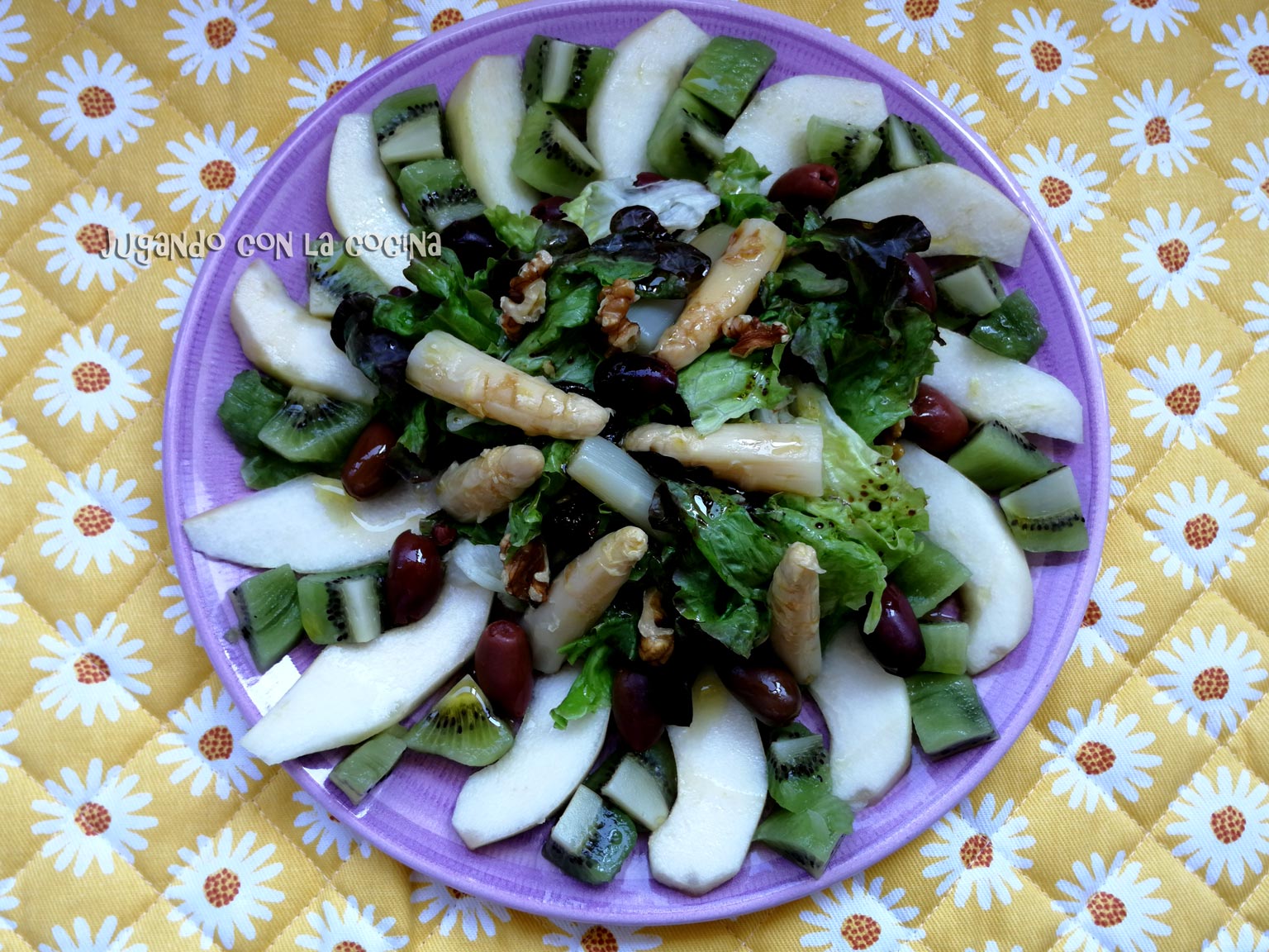 Esta ensalada tiene unos ingredientes que encontramos en cualquier época del año, pero si conseguimos fruta de temporada su sabor es mucho mejor.