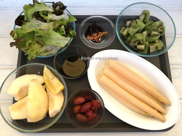 Junto a la pera y el kiwi ponemos unos espárragos de lata, unas nueces, ciruelas pasas y unas aceitunas Kalamata, complementando así el aporte de fibra y un punto salado. Y por supuesto que no falten unos brotes tiernos de lechuga, todo aliñado con una buena vinagreta.