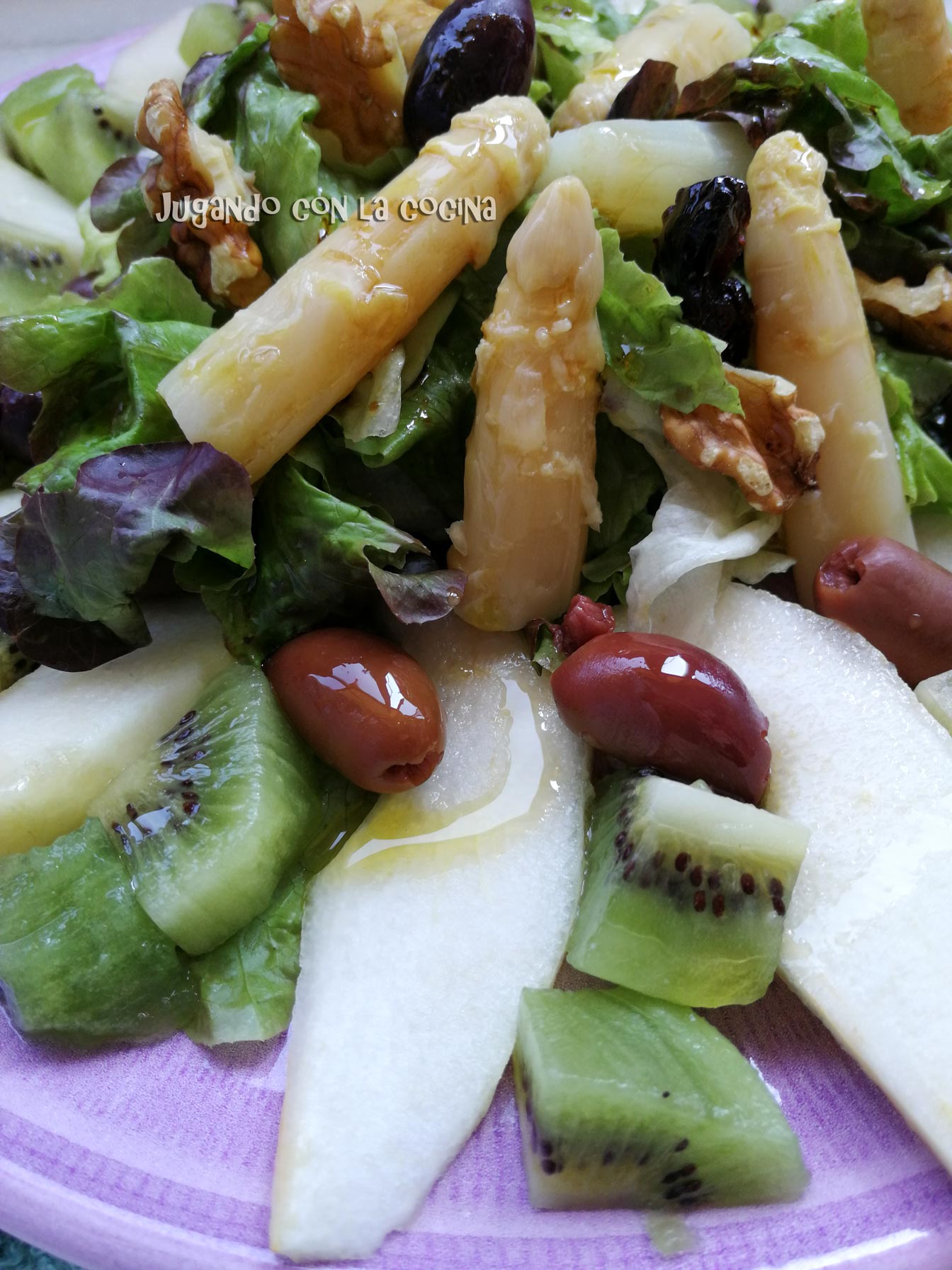 Montamos la ensalada colocando como base los brotes de lechuga, alrededor la pera, y vamos colocando por encima los dados de kiwi, los espárragos troceados y escurridos, las aceitunas y las nueces y ciruelas pasas troceadas. Rociamos con la vinagreta y servimos.