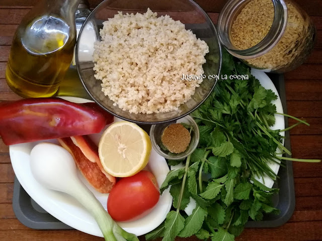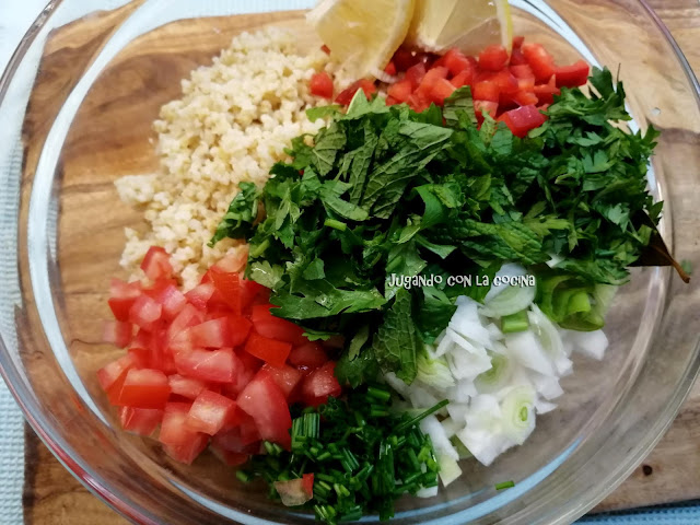Lógicamente esta ensalada admite variación de ingredientes, cilantro en lugar o además del perejil, , cebolla morada en lugar de cebolleta, cebollino, aceitunas, cous-cous en vez de bulgur, etc, digamos que según disponibilidad o a gusto del consumidor se acompaña con otras verduras y hortalizas.Elaboración