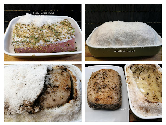 NOTA: Se puede añadir una clara de huevo a la sal para que quede más compacta o humedecerla, aunque yo no lo hago y la costra se forma igual.